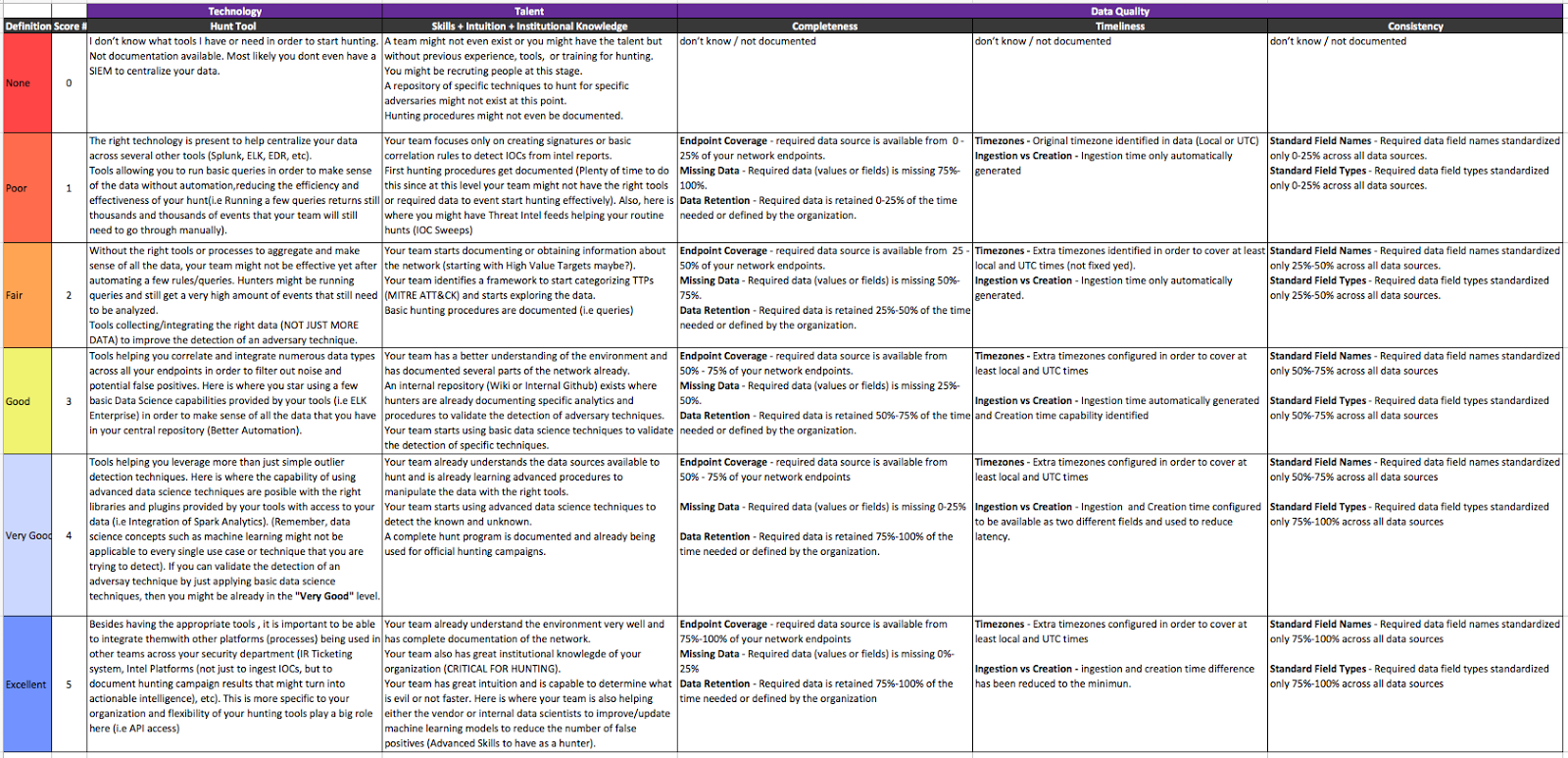 In this post, I wanted to take my current heatmap sheet/approach and go a little bit deeper on one of the main factors of a hunt program that, in my opinion, should be assessed and measured before your first engagement: "Data." I know you want to start hunting (do the cool stuff) and show/learn all the different ways to find evil; however, without the right data quality, it is very hard to focus on the mission, be productive, and hunt effectively.