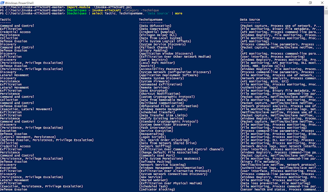 $techniques | select Tactic, TechniqueName, ‘Data Source’ | more