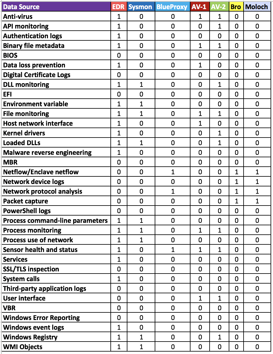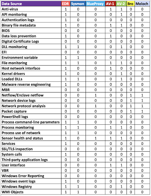 It is time to identify the data sources that you have. One way to expedite this process is by looking at the tools that your organization has purchased or configured to give you the data that you are currently working with. For example, instead of coming up with data source names, such as the ones from MITRE, I recommend starting to document the tools that are present in your environment such as, for example, Sysmon, OSQuery, Moloch, AV, Bro, EDR solutions, etc.