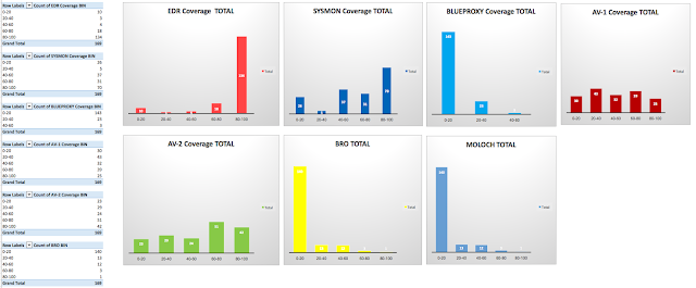 Once you take the percentages per technique and tool, you can then create bins to organize your results (0-20, 20-40, 40-60, 60-80, 80-100). You will be able to see the numbers of techniques mapped to the percentage of data sources provided by each tool as shown in Figure 9 below.